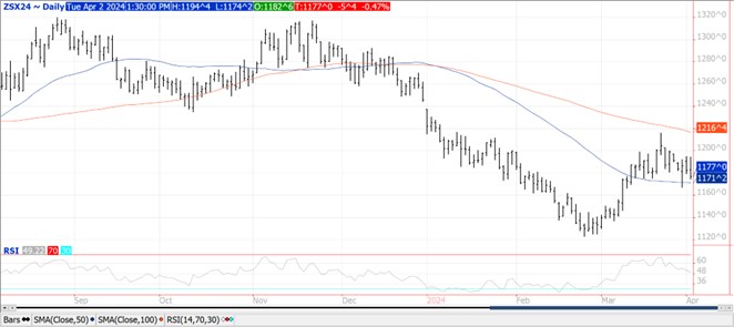 Prices were down another $.06 – $.09 today with spot May-24 erasing all of Thursday’s gains following the supportive USDA data.  Dec-24 corn closed below its 50 day MA support at $4.69 ½, however held above LW lows.  Spreads weakened with several making new all-time lows.  US corn plantings at 2% matched YA pace and above 5-year Ave. of 1%.  A drier outlook this week across the Gulf coast and Delta region should promote better planting conditions.  Newswire reports suggest Chinese custom officials are encouraging importers to slow corn imports to help firm domestic prices as farmers begin to plant.  EU corn imports since July-23 have reached 13.5 mmt, down 38% from YA.  Corn used in the production of ethanol in Feb-24 at 442 mil. bu. was in line with expectations and just above Jan-24 usage.  It was up nearly 11% from Feb-23.  In the first 6 months of the 23/24 MY corn usage has reached 2.714 bil. bu. up 6.5% from YA, vs. the USDA est of up 4. Tomorrow’s EIA report is expected to show ethanol production to range from 1,037 – 1,060 tdb vs. 1,054 tbd the previous week.  Adjusting the USDA Outlook corn balance sheet to reflect the lower acreage forecast from last week still leaves a build in US corn inventories to nearly 2.40 bil. bu.