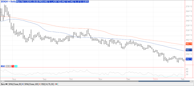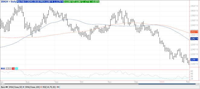 Prices closed higher across the complex with several contracts closing at or near session highs.  Beans were up $.05 – $.08, meal was $2 – $4 higher while oil was up 40 – 60.  Bull spreading was also noted across the complex.  Mch-24 beans made a fresh 7 month low before recovering.  Key support lies just below today’s low at $11.75.  Resistance is at last week’s high of $12.23.  Mch-24 oil also fell to a new 8 month low before recovering.  Support is at its contract low 44.49 from last May-23. Resistance for Mch-24 meal is at last week’s high of $370.40.  Weather concerns in Argentina remain elevated as extreme heat and limited rainfall this weekend kept stress levels high.  Temperatures are expected to remain well above normal with very scattered showers thru mid-week.  Better prospects for beneficial rains toward the end of this week and weekend which was reinforced with midday forecasts.  Even with healthy rains next week, top end yield potential has likely been compromised.  Conditions in Brazil are mostly favorable however dryness concerns are building in the interior south.  Export inspections at 52 mil. bu. were well above expectations and the pace needed to reach the USDA export forecast of 1.755 bil. bu.  YTD inspections at 1.070 bil. are down 24% from YA, vs. the USDA forecast of down 12%. AgRural estimates the Brazilian soybean crop is 16% harvested, vs. 9% from YA and 5-year Ave. of 10%.  Last week MM’s were net sellers of just over 16k contracts of soybeans, 3k meal, and nearly 10k contracts of bean oil.  Their combined short position in the soybean complex has swelled to nearly 185k contracts, the largest since May-2019.