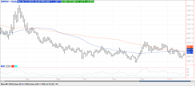 Prices were mostly higher with Chicago and MGEX up $.01 – $.05 while KC was mixed and with a penny of unchanged.  Mch-24 Chicago briefly traded over $6 with key resistance at the 50 and 100 day MA’s at $6.04 ¾ and $6.06 ¼ respectively.  First resistance for Mch-24 KC is last week’s high at $6.22 ½ followed by the 50 day MA at $6.32 3/5.  Export inspections at 12 mil. bu. were in line with expectations.  YTD commitments at 394 mil. are down 16% from YA, vs. the USDA forecast of down 4.5%.  MM’s were net sellers across all 3 classes last week as their combined short position swelled to nearly 137k contracts, the largest in 6 weeks, however well below the record short position of 199k in early Dec-23.  IKAR reports Russian wheat export price ended last week at $238/mt down from $242/mt the previous week.  SovEcon reports Russian grain exports last week fell 13% from the previous week to 650k mt, which included 580k mt of wheat.  S&P Global is forecasting spring wheat acres at 11.1 mil., down 100k from YA.