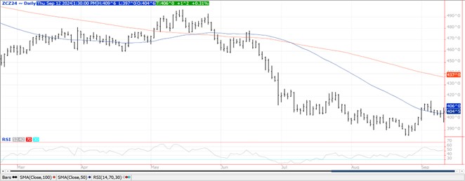 The soybean complex was higher with beans up $.09-$.11, meal was $3 higher while oil was up 40-55.  An initial rally in Nov-24 soybeans stopped just shy of this week’s high at $10.20 before backing off.  Inside day for Oct-24 oil closing back above $.40 lb.  Oct-24 meal held support above its 50 day MA at $313.60.  Next resistance is the September high at $328.50.  US production was cut 3 mil. bu. to 4.586 bil. nearly 25 mil. below expectations.  Record yields were left unchanged at 53.2 bpa.  Old crop stocks were cut 5 mil. to 340 mil. in line with expectations as a result of higher crush.  New crop stocks were cut 10 mil. bu. to 550 mil., roughly 35 mil. below expectations.  The USDA raised the amount of bean oil used in biofuel production by 100 mil. lbs. to 13.0 bil., right back where it was in July.  Global stocks were little changed at 134.6 mmt, in line with expectations.  Chinese imports were left at 111.5 mmt for 2023/24 and 109 mmt for 2024/25. Weekly exports at 54 mil. bu. were in line with expectations and bring 2024/25 commitments to 523 mil. down 14% from YA vs. the USDA forecast of up 2%.  Commitments are the lowest in 5 years.  Shipments are down 23%.  China/unknown combined to buy 40 mil. bu.  I look for the USDA to raise 23/24 exports 10 mil. bu. to 1.710 bil.   Conab left their 23/24 Brazilian production forecast unchanged at 147.4 mmt.  They will provide their 1st 24/25 production forecasts in Oct-24.  Abiove lowered their 23/24 soybean forecast .2 mmt to 153 mmt, in line with the USDA.  Hurricane Francine made landfall last night in LA.  The center of the storm has moved north into MS and the Delta region today.  Only minor production damage to soybeans is expected.  Cumulative rains of 2-8” were felt in LA with 1-4” totals more common in the rest of the Delta, SE and southern Midwest.  Little moisture is expected west of the Mississippi river.  Above normal temperatures and little rain this week across much of the WCB and NC Midwest will continue to push corn and soybean crop toward maturity.  Outside of some scattered rains for southern Brazil much of SA crop areas will remain dry over the next 7-10 days.